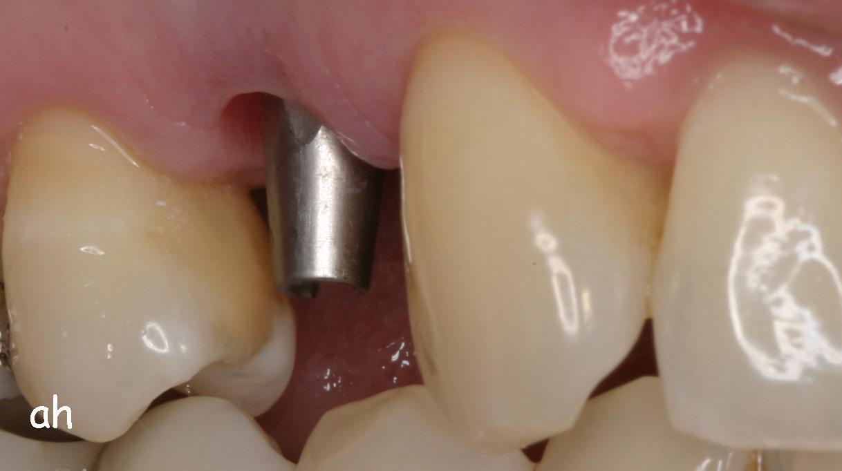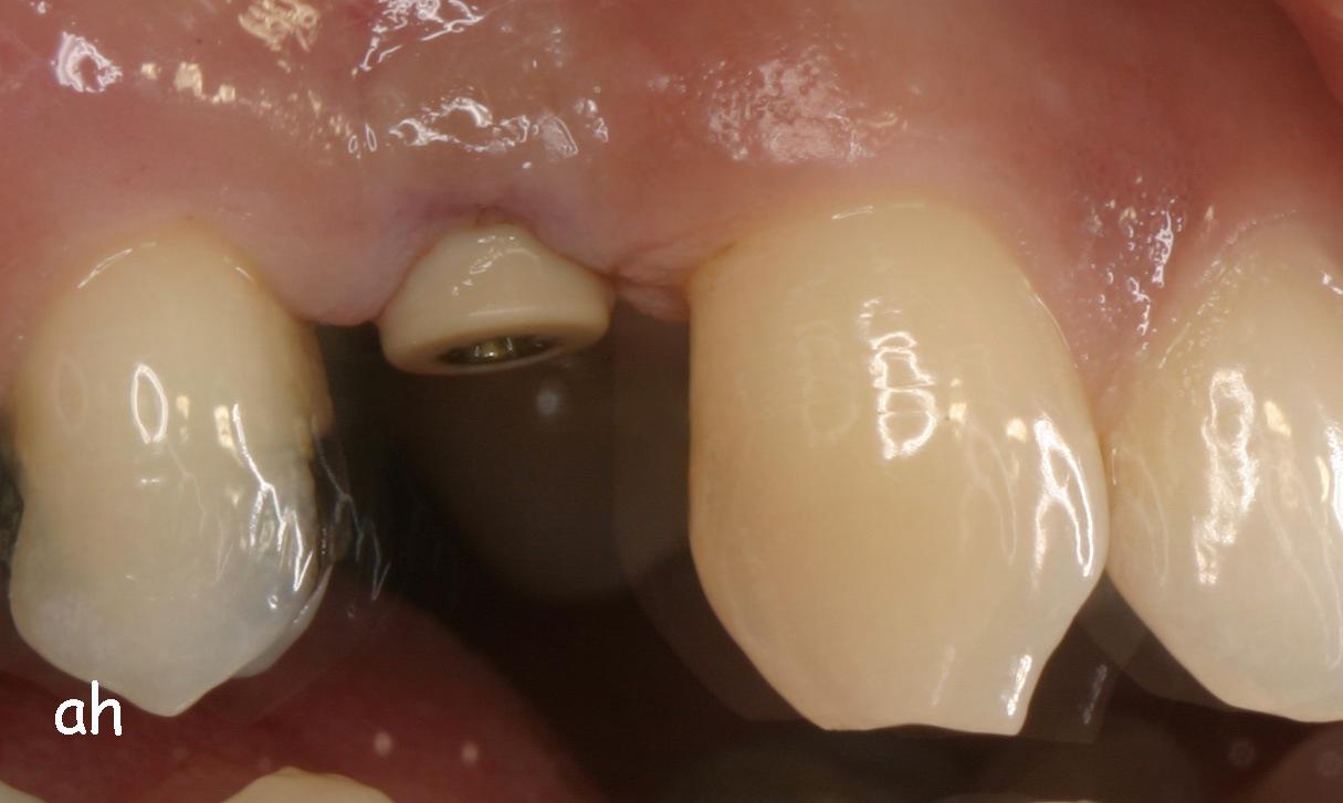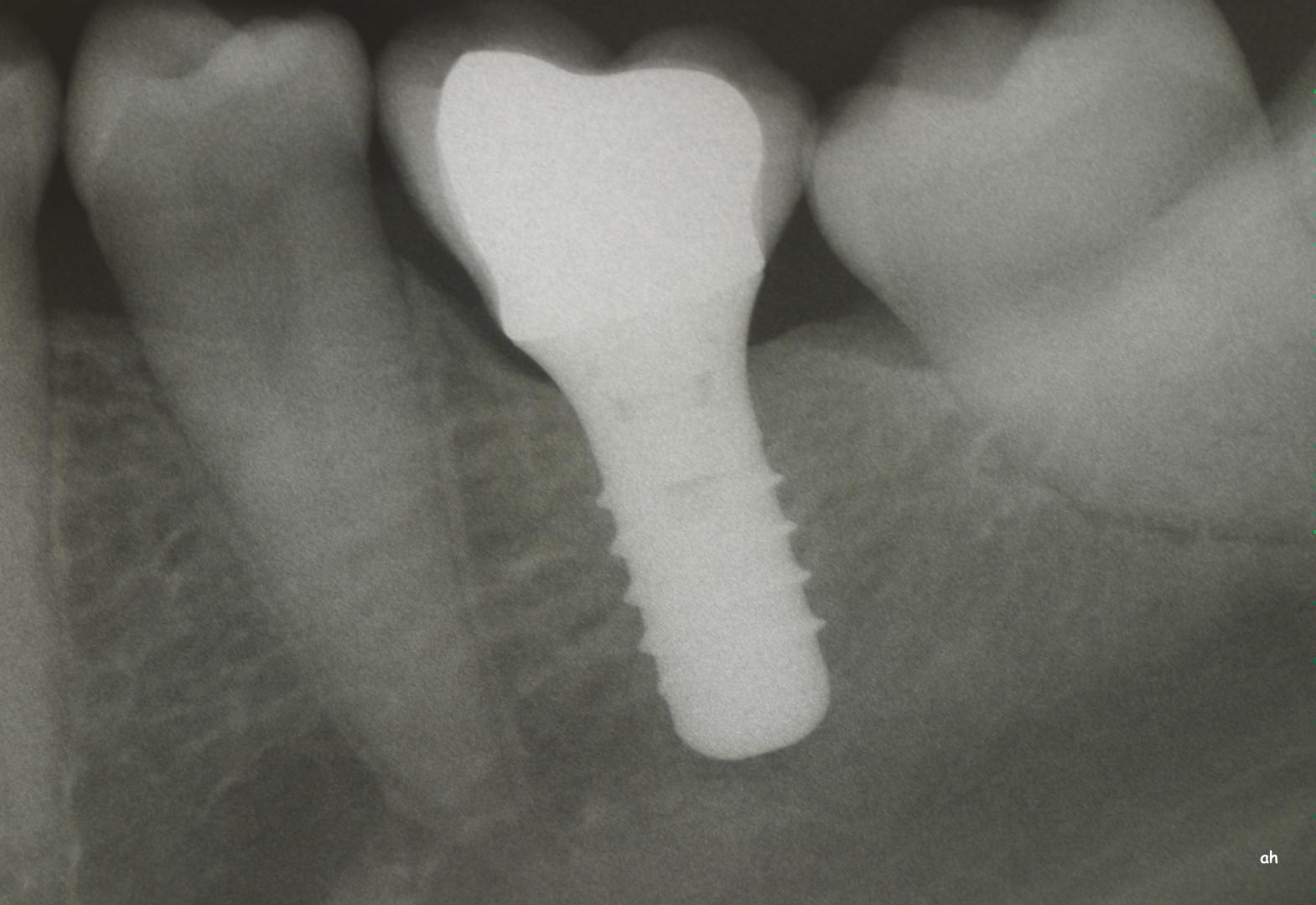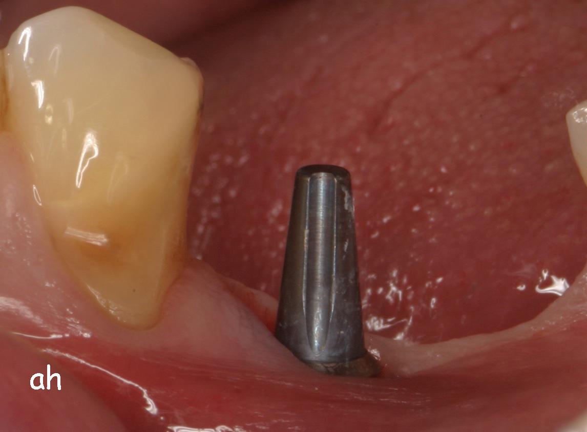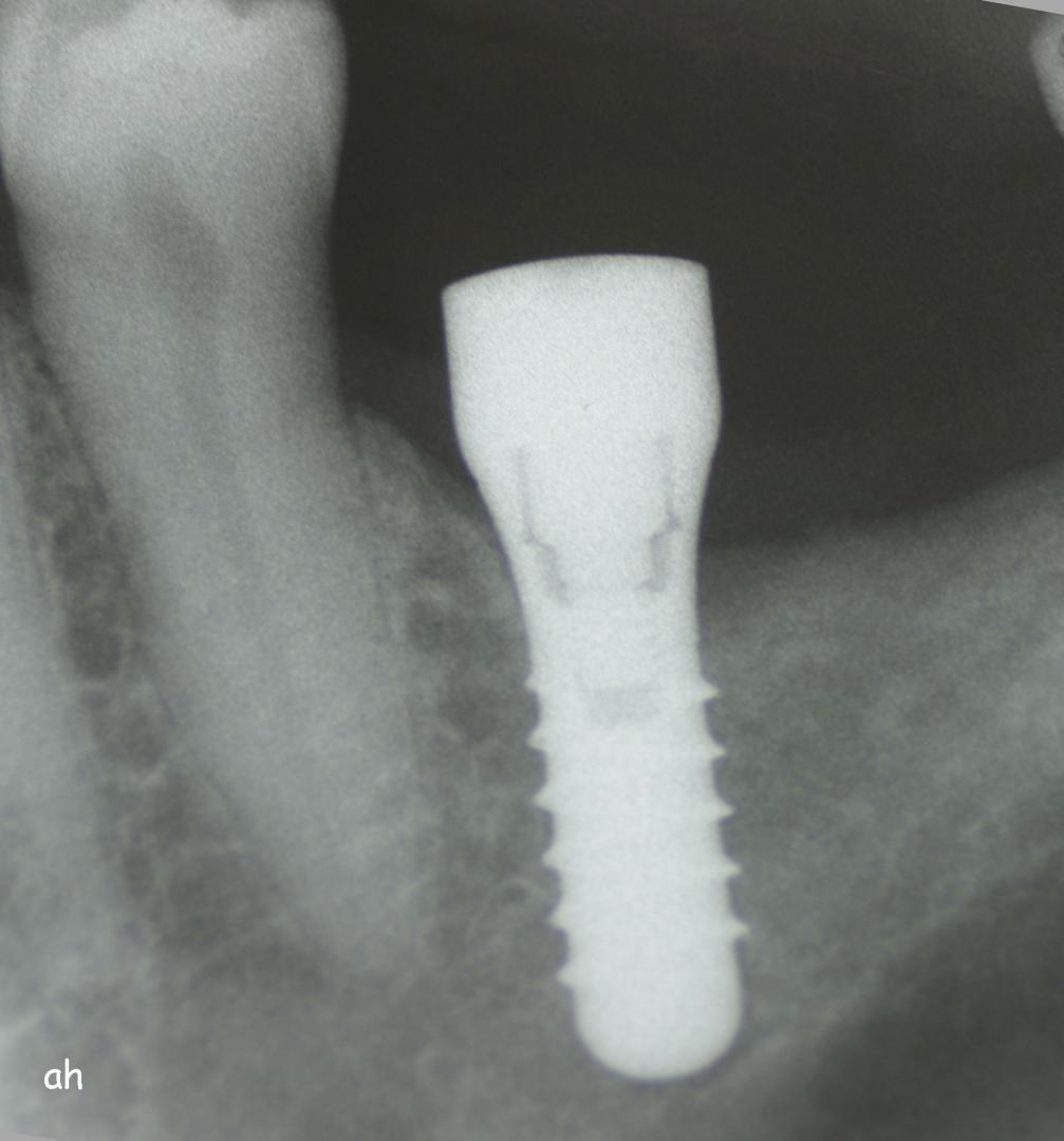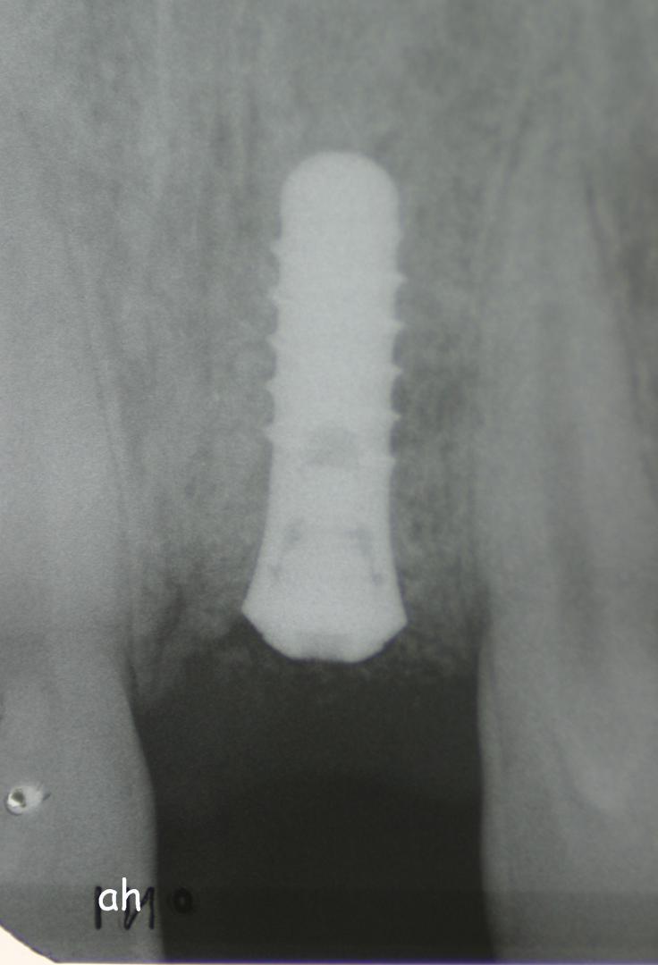 L'intégration de l'implant dans l'os se fait en 6 à 12 semaines, pendant ce laps de temps il est préférable de ne pas trop charger l'implant. Plus tard une empreinte est effectuée, le laboratoire confectionne une couronne en céramique que l'on fixera sur l'implant.