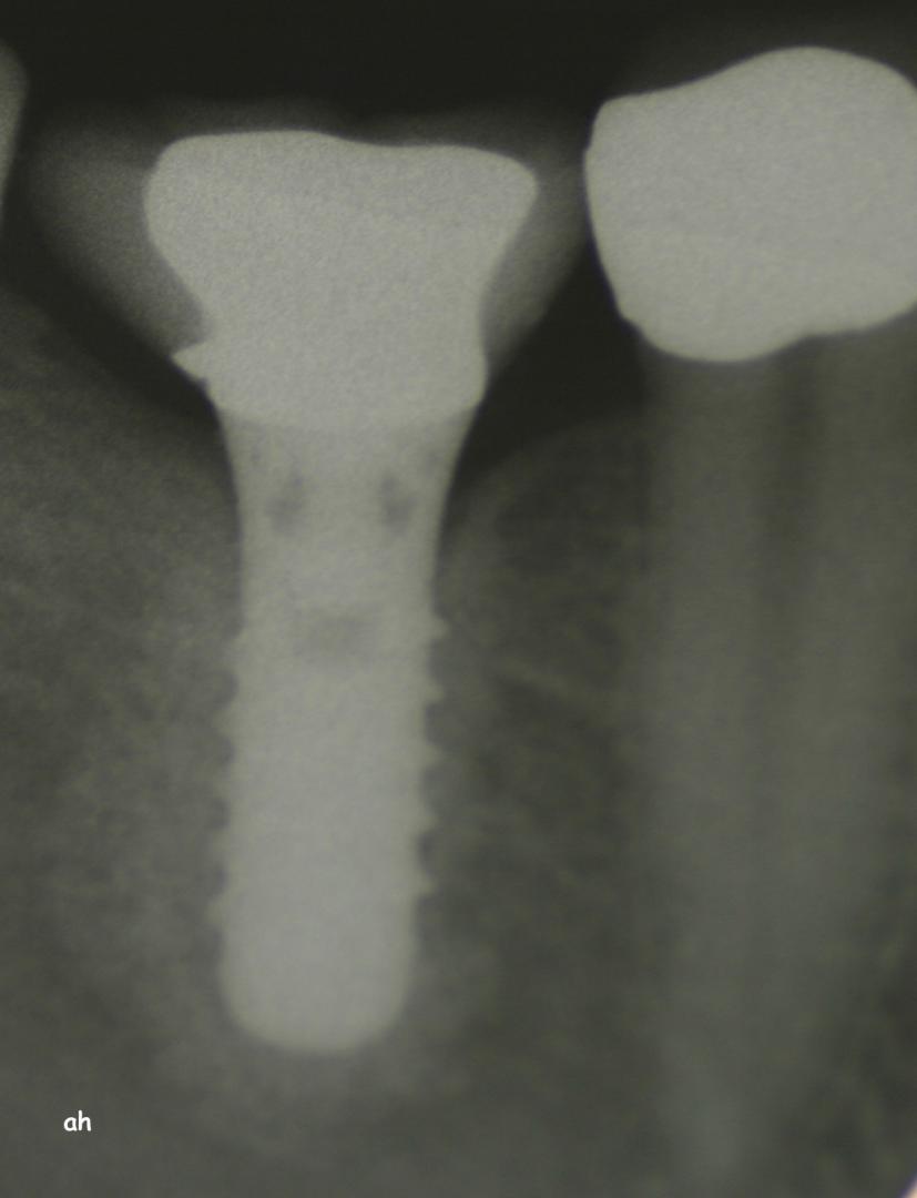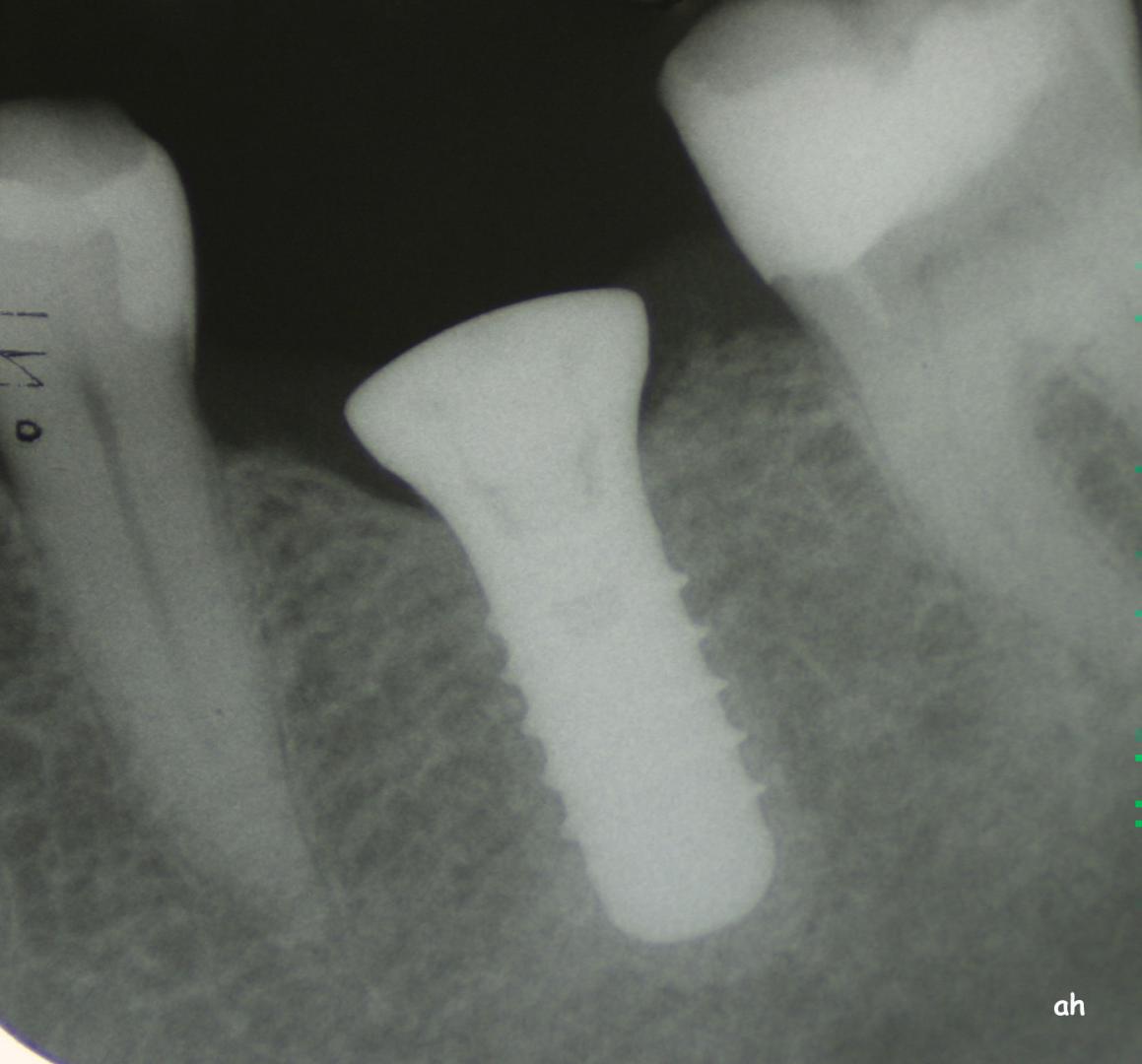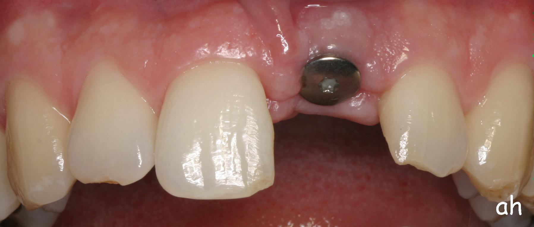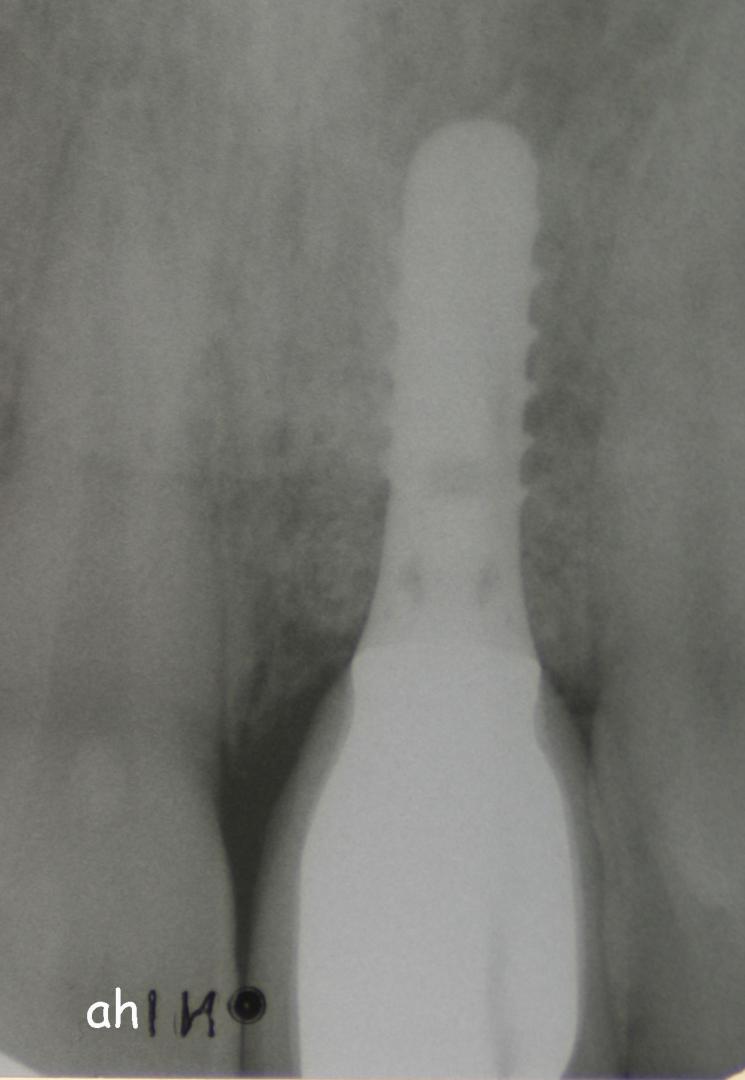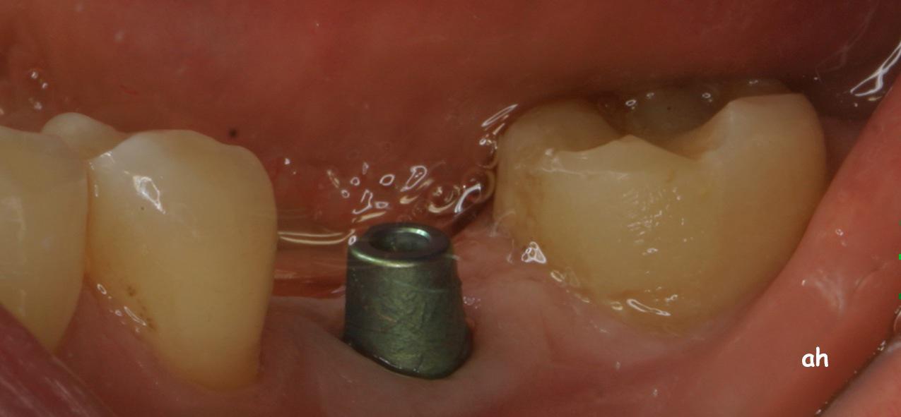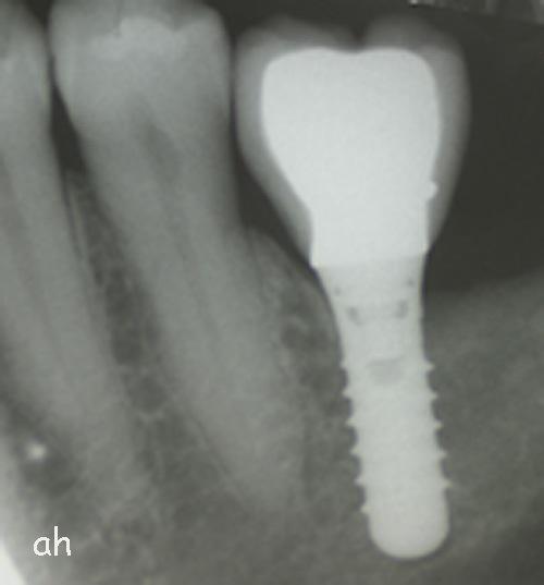L'intégration de l'implant dans l'os se fait en 6 à 12 semaines, pendant ce laps de temps il est préférable de ne pas trop charger l'implant. Plus tard une empreinte est effectuée, le laboratoire confectionne une couronne en céramique que l'on fixera sur l'implant.