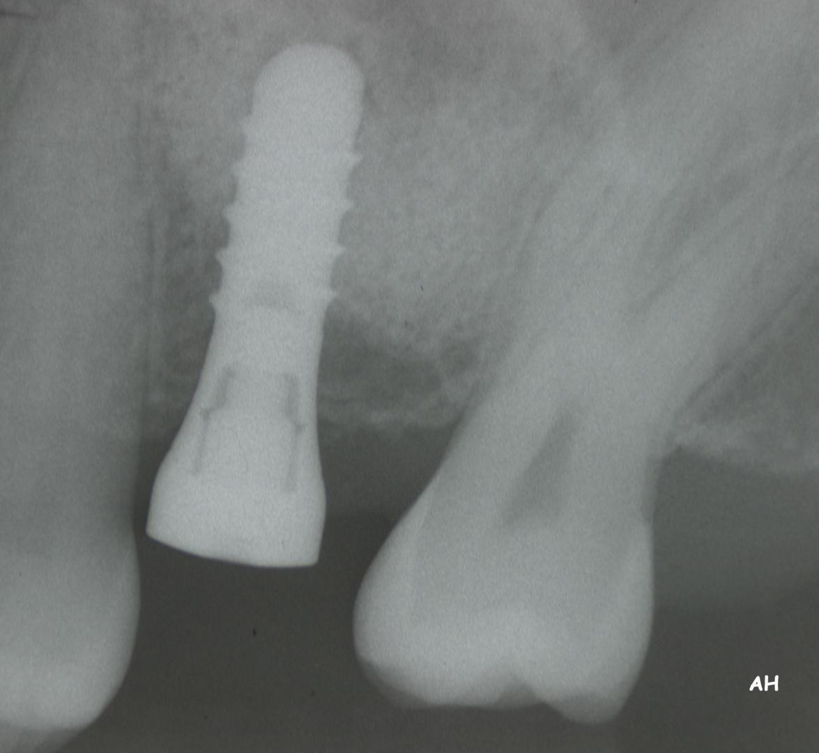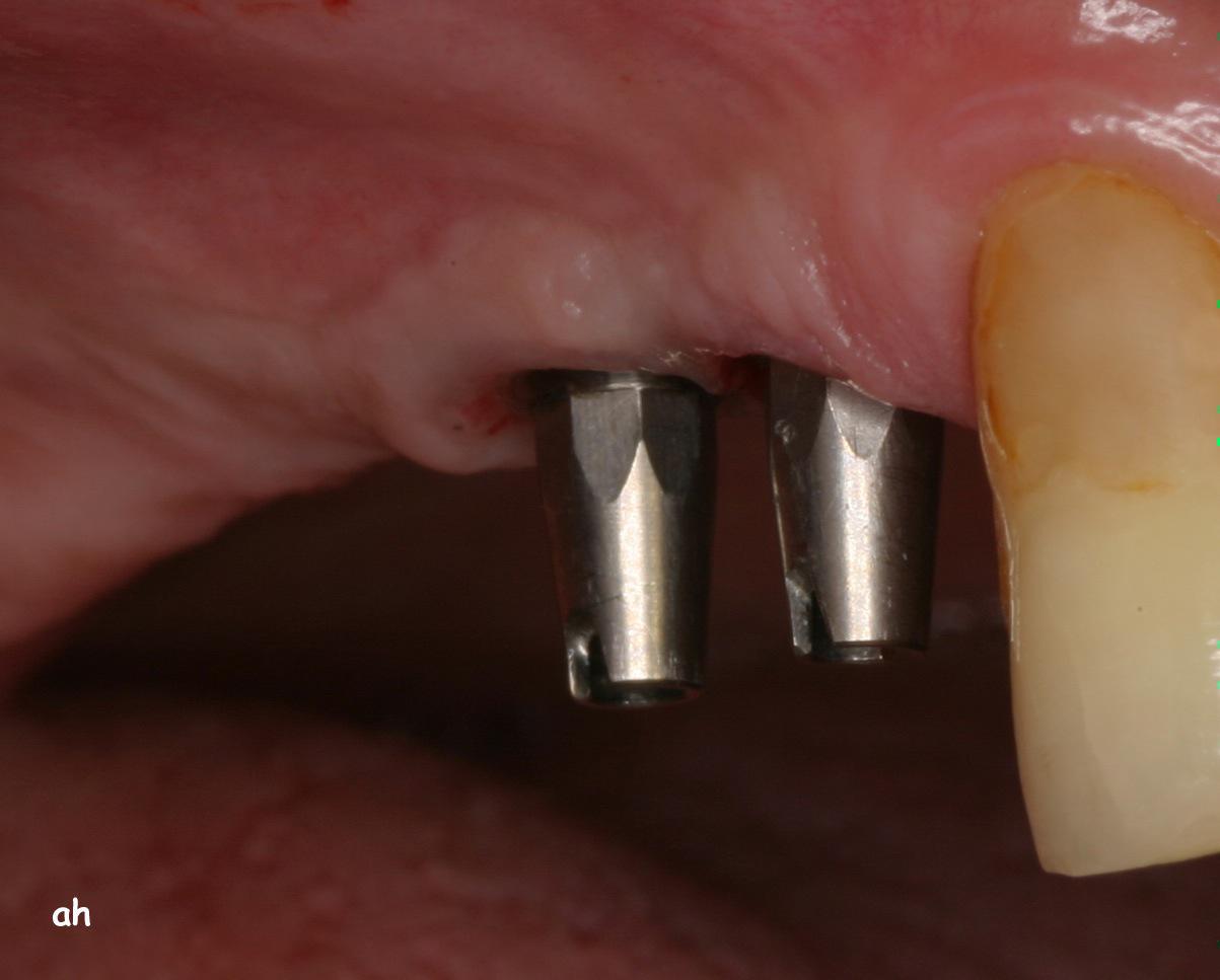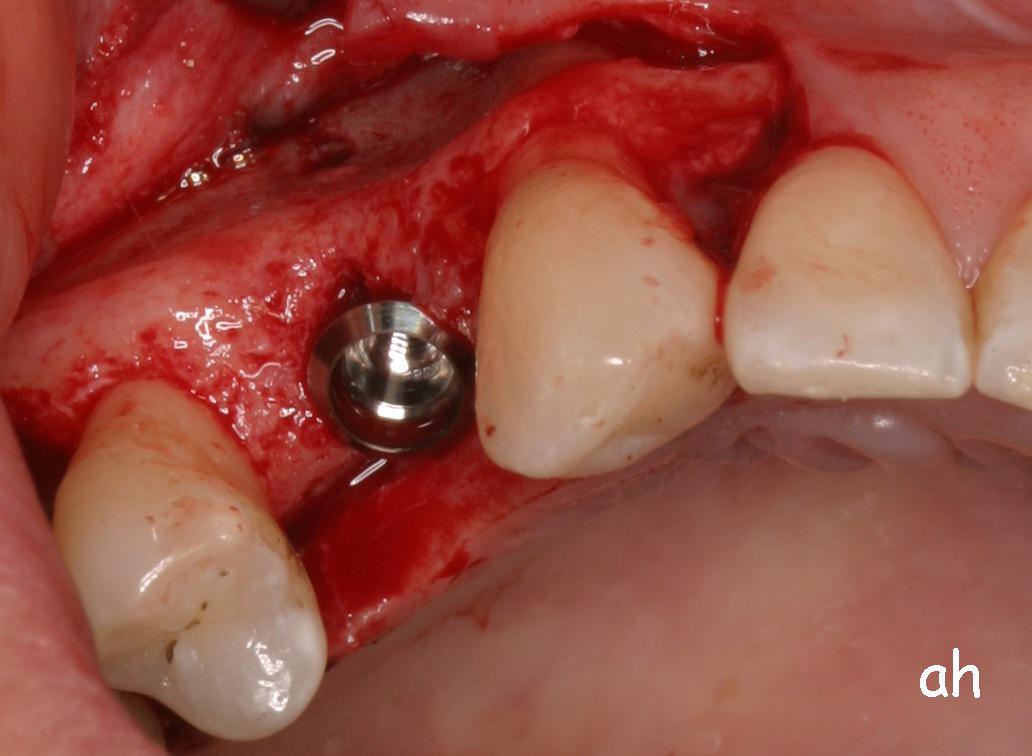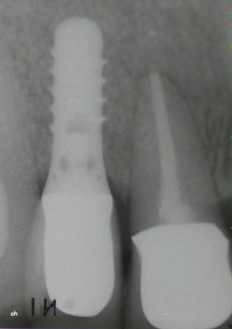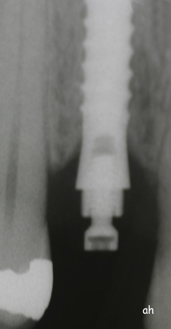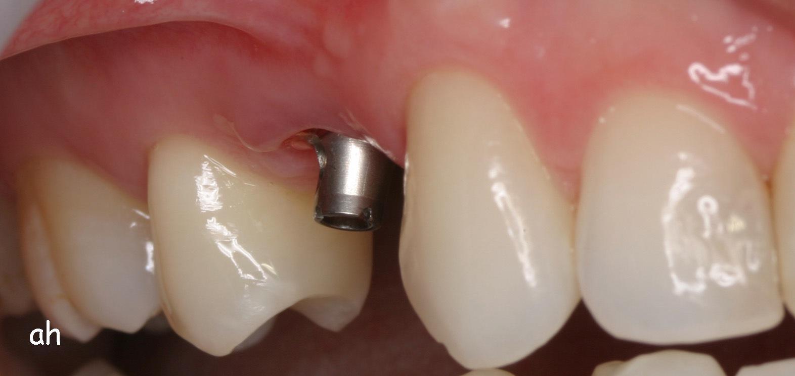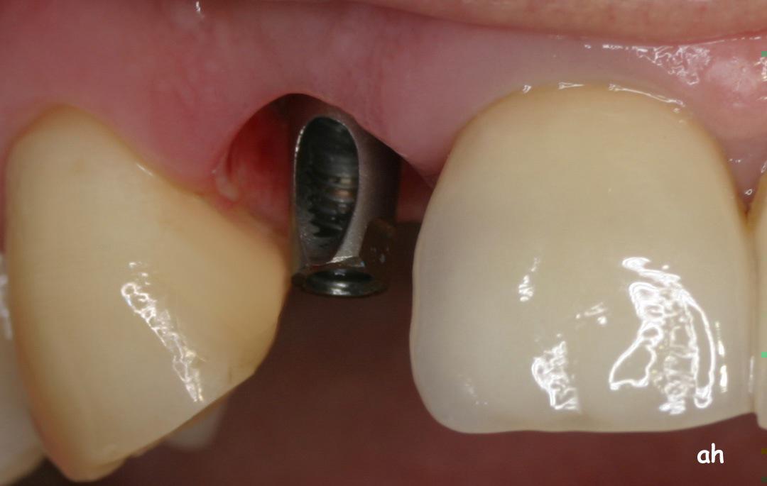 L'intégration de l'implant dans l'os se fait en 6 à 12 semaines, pendant ce laps de temps il est préférable de ne pas trop charger l'implant. Plus tard une empreinte est effectuée, le laboratoire confectionne une couronne en céramique que l'on fixera sur l'implant.